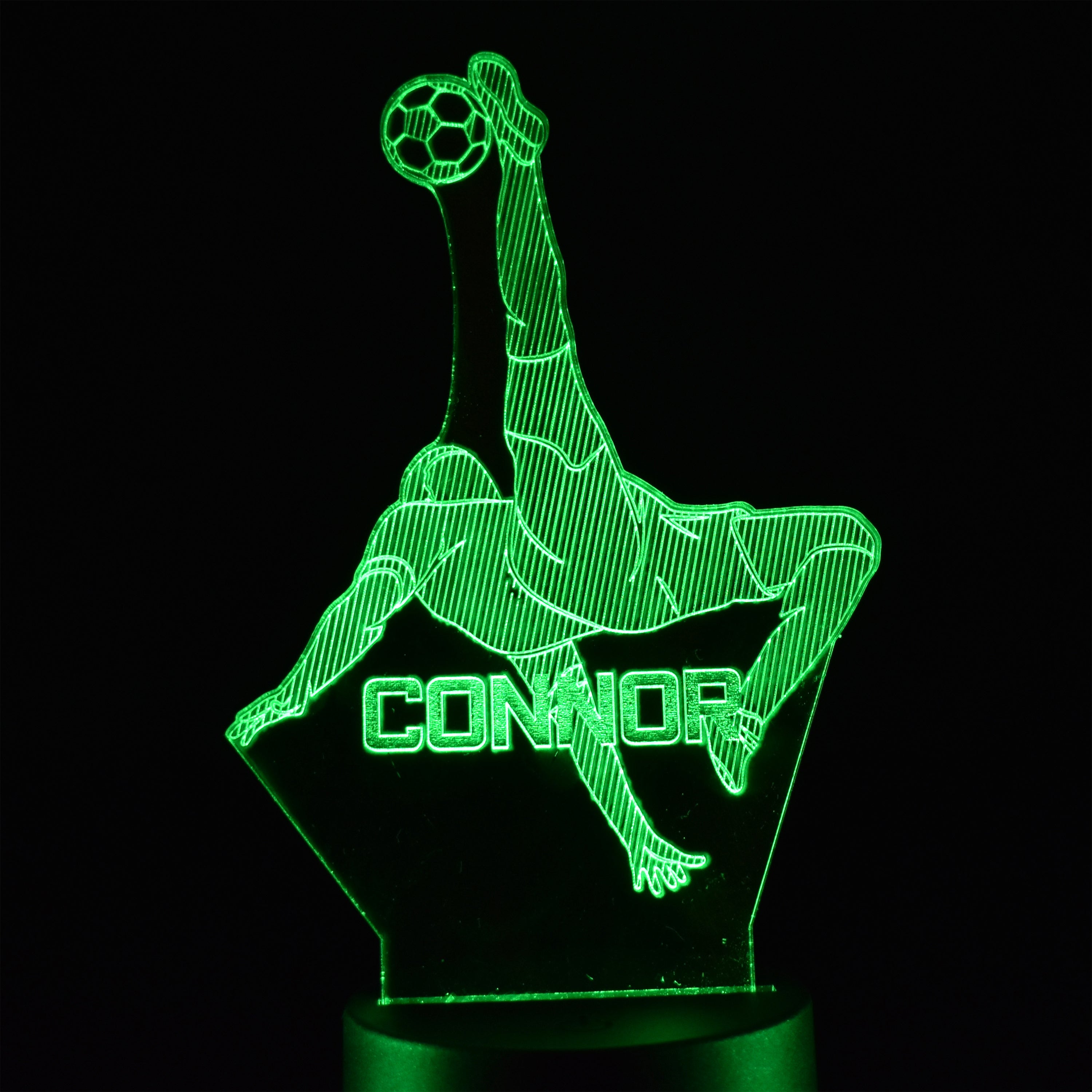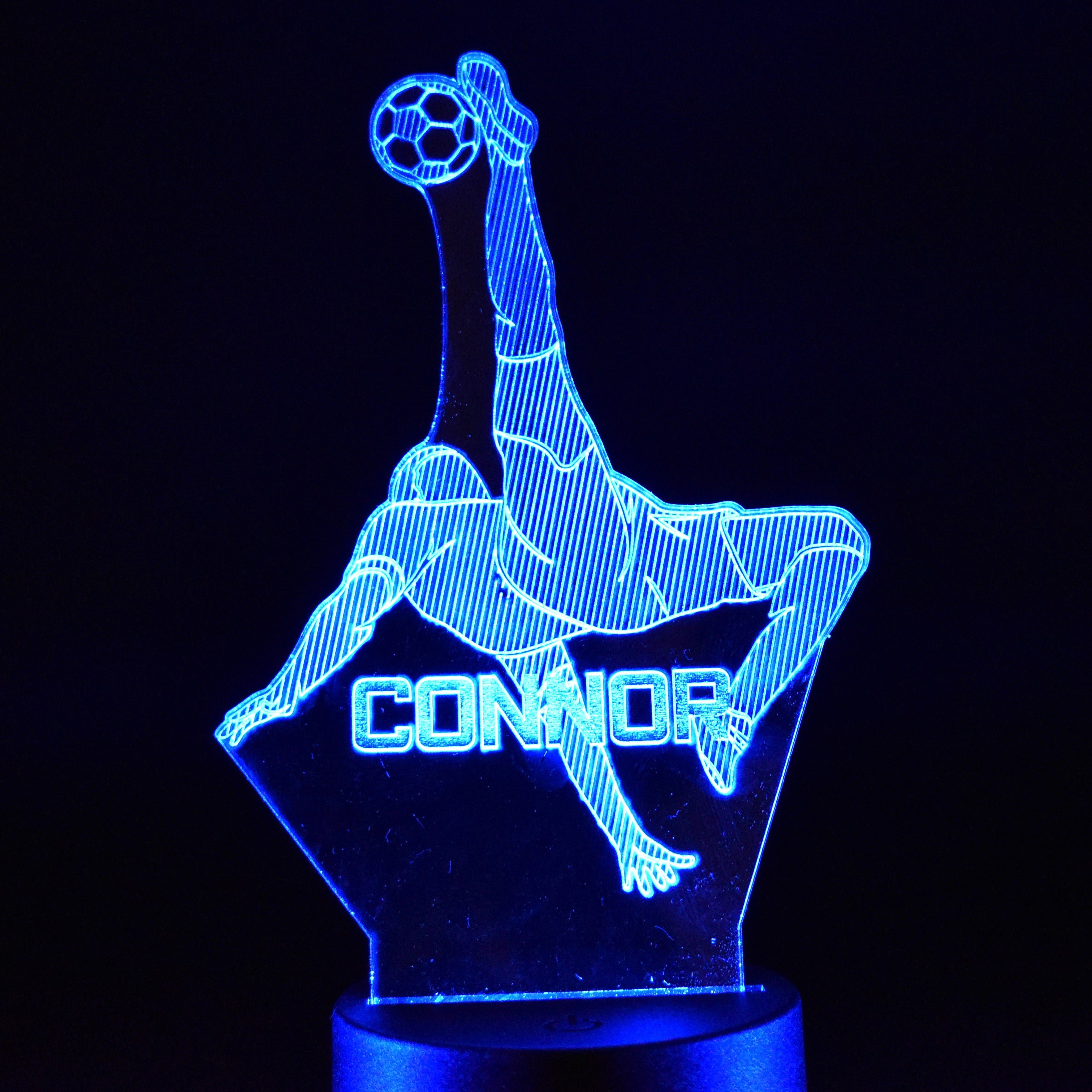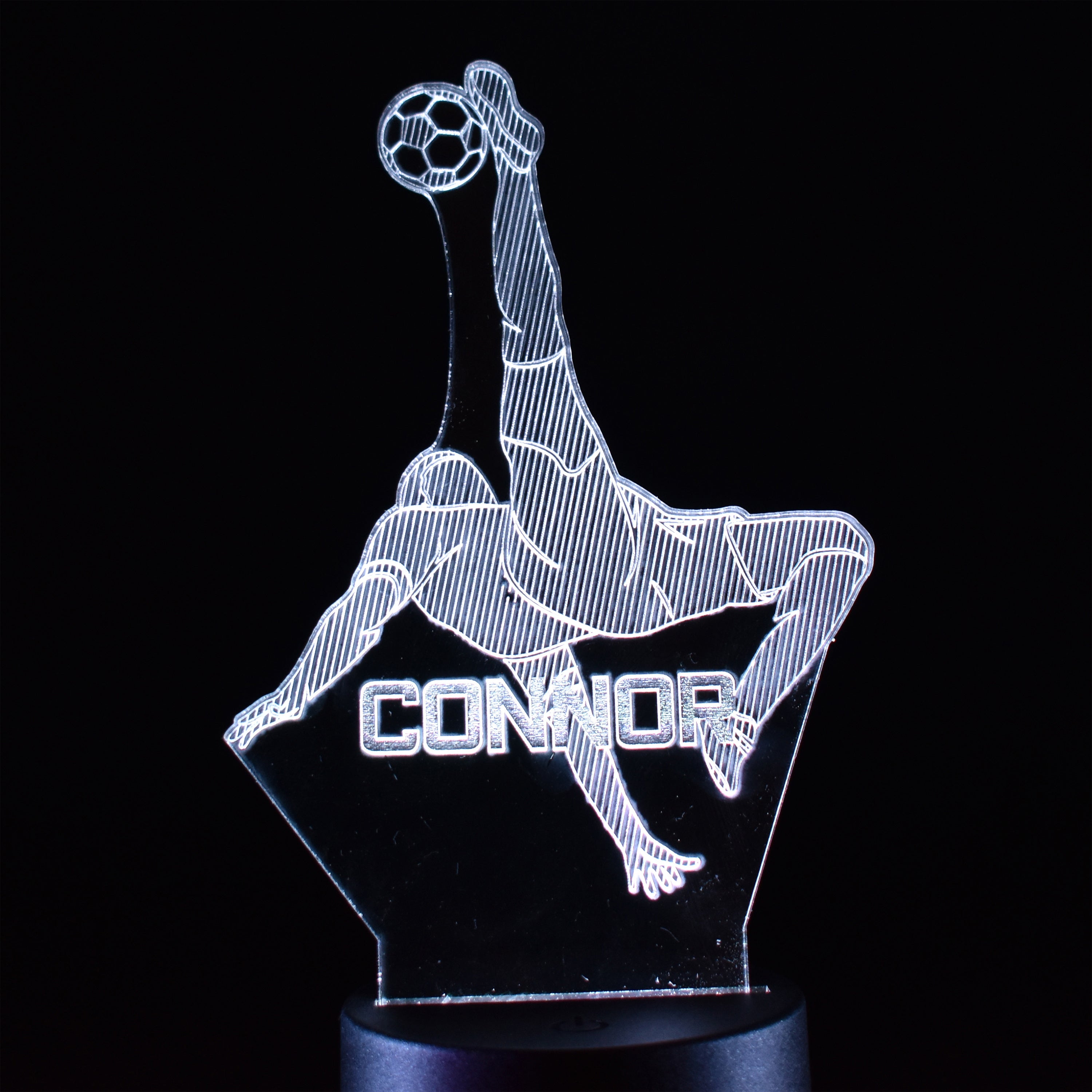 This football design laser engraved night light is perfect for lighting any room. It has 16 colour options & different light modes that can be selected using the included remote control. The high quality tough clear acrylic is cut & engraved with our precision laser machine & lit with a circular LED base that can be powered by the micro USB cable included or with 3x AA batteries (not included).