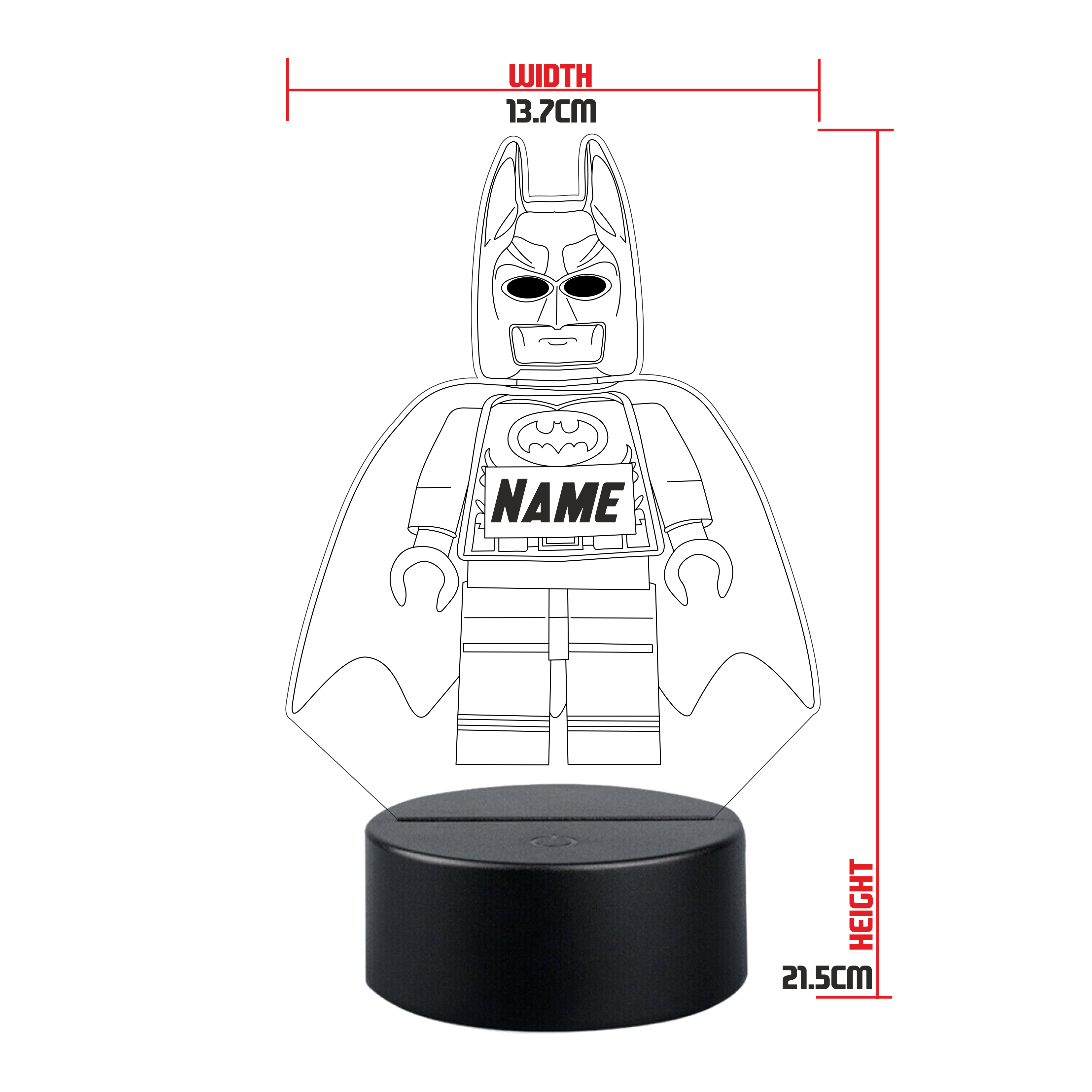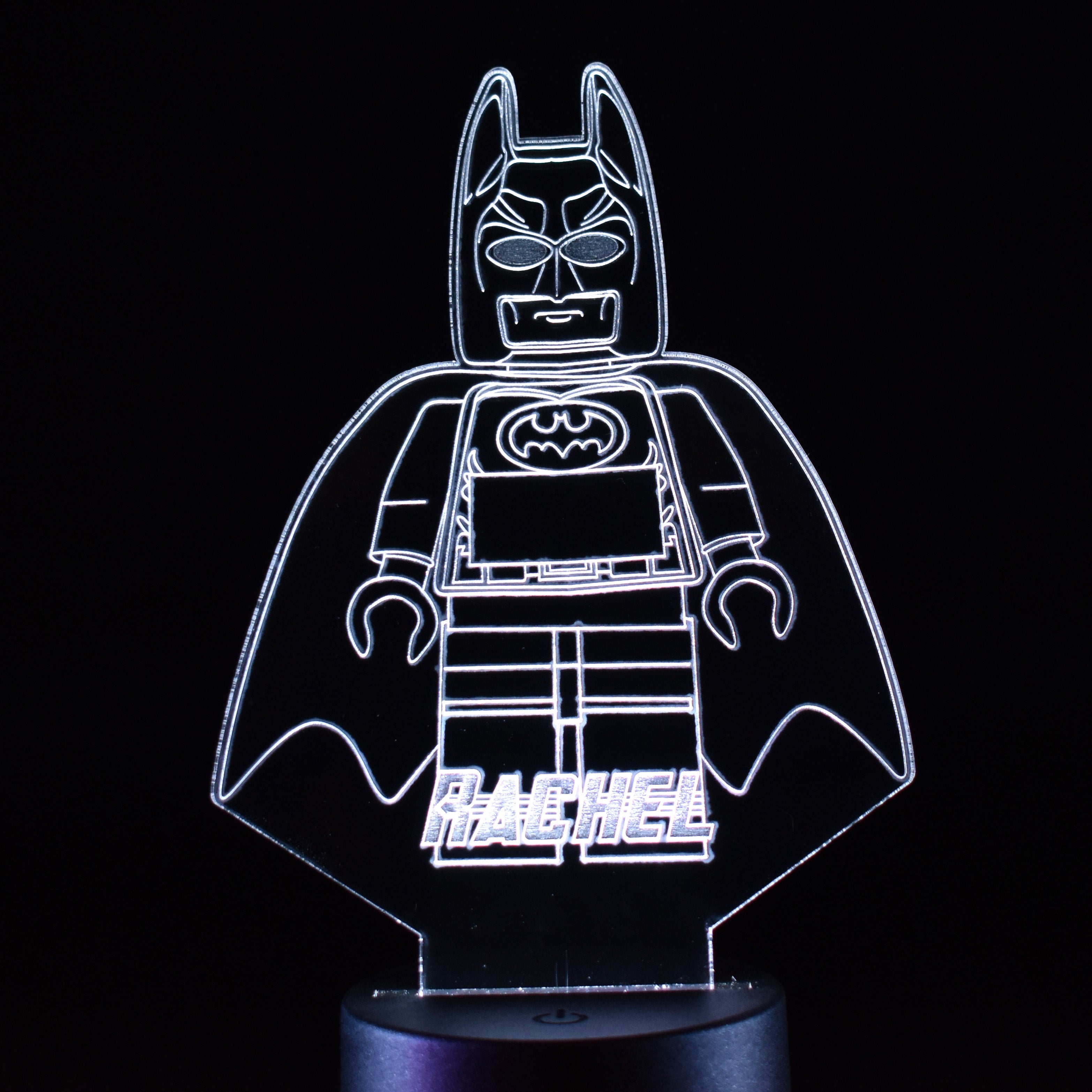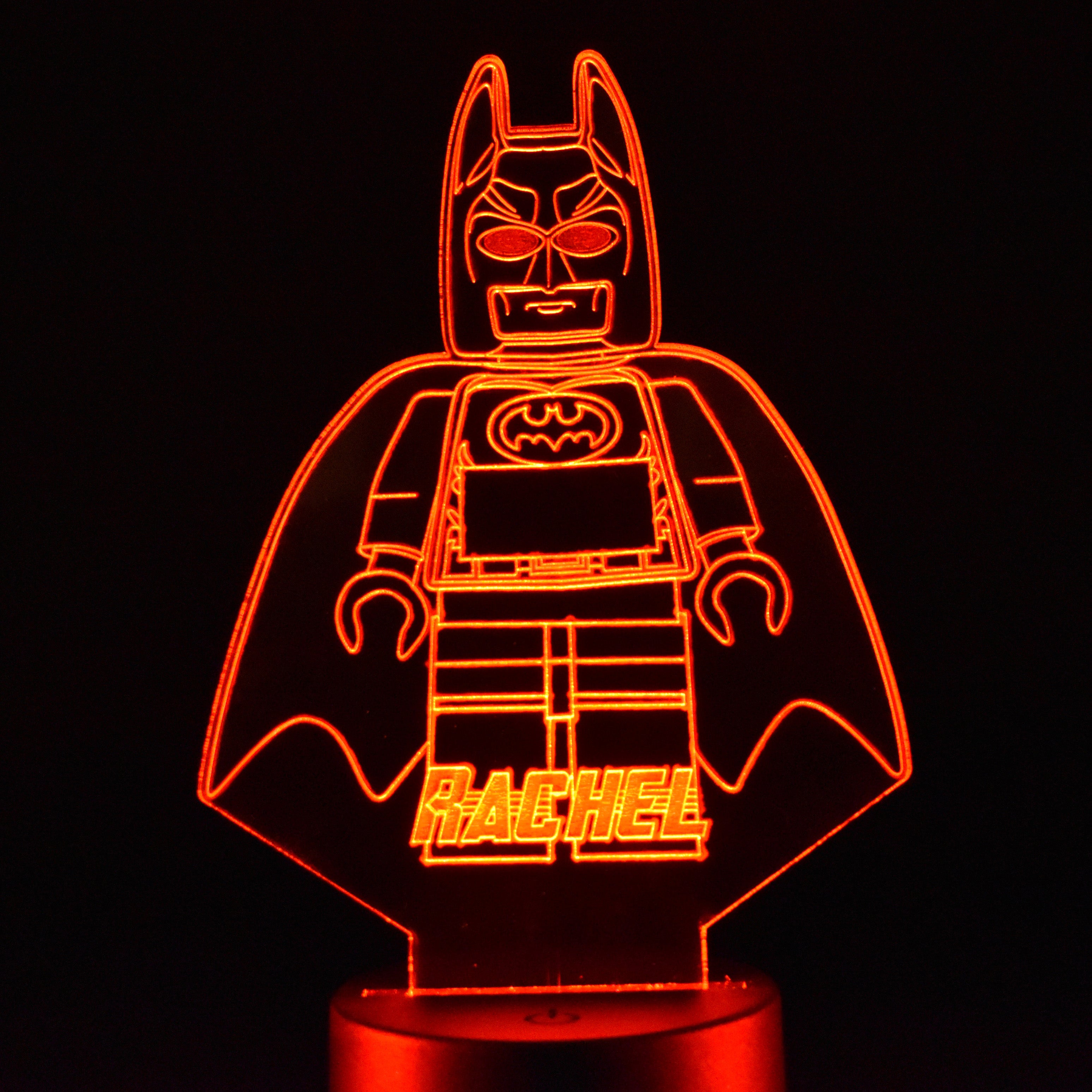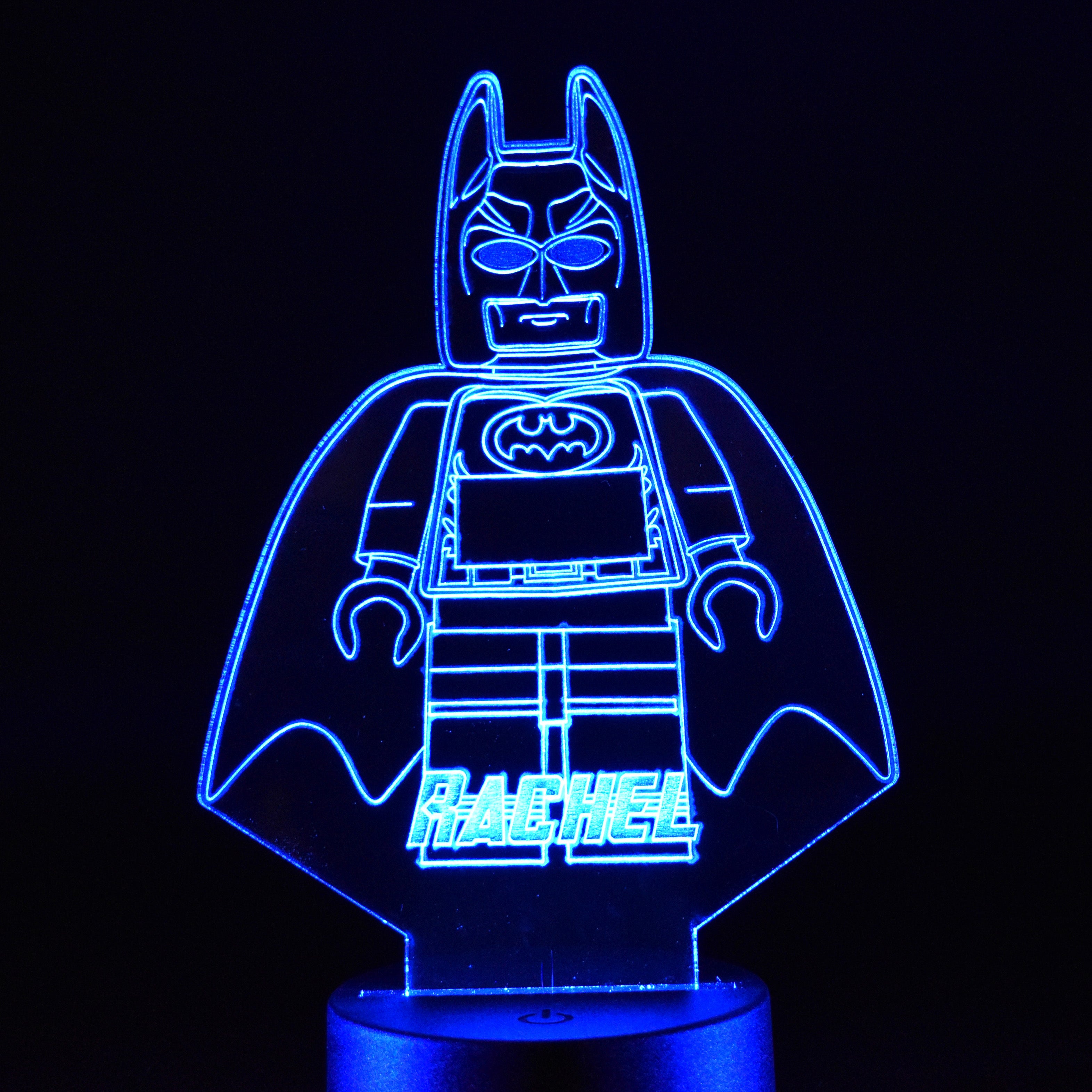 This Lego Batman design laser engraved night light is perfect for lighting any room. It has 16 colour options & different light modes that can be selected using the included remote control. The high quality tough clear acrylic is cut & engraved with our precision laser machine & lit with a circular LED base that can be powered by the micro USB cable included or with 3x AA batteries (not included).