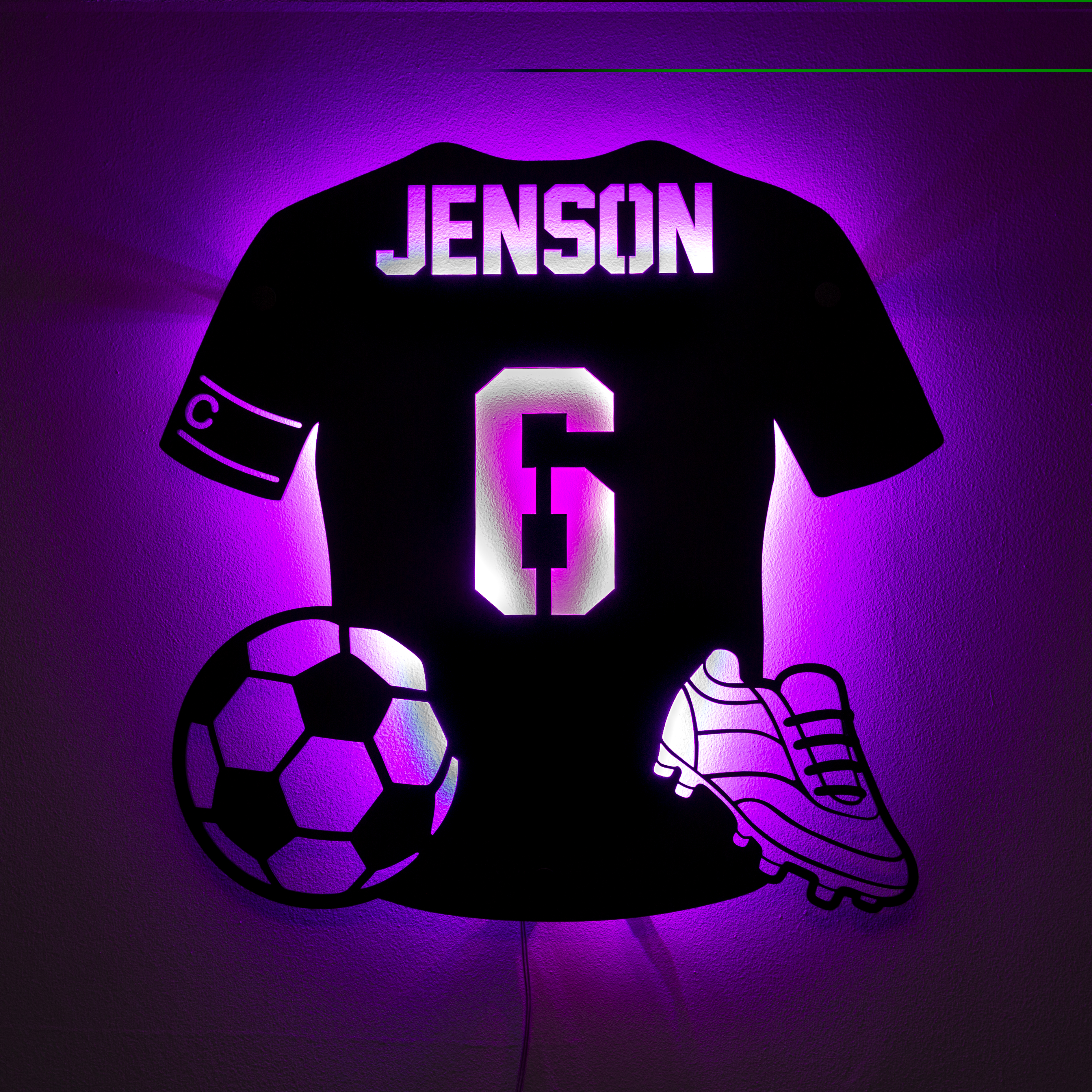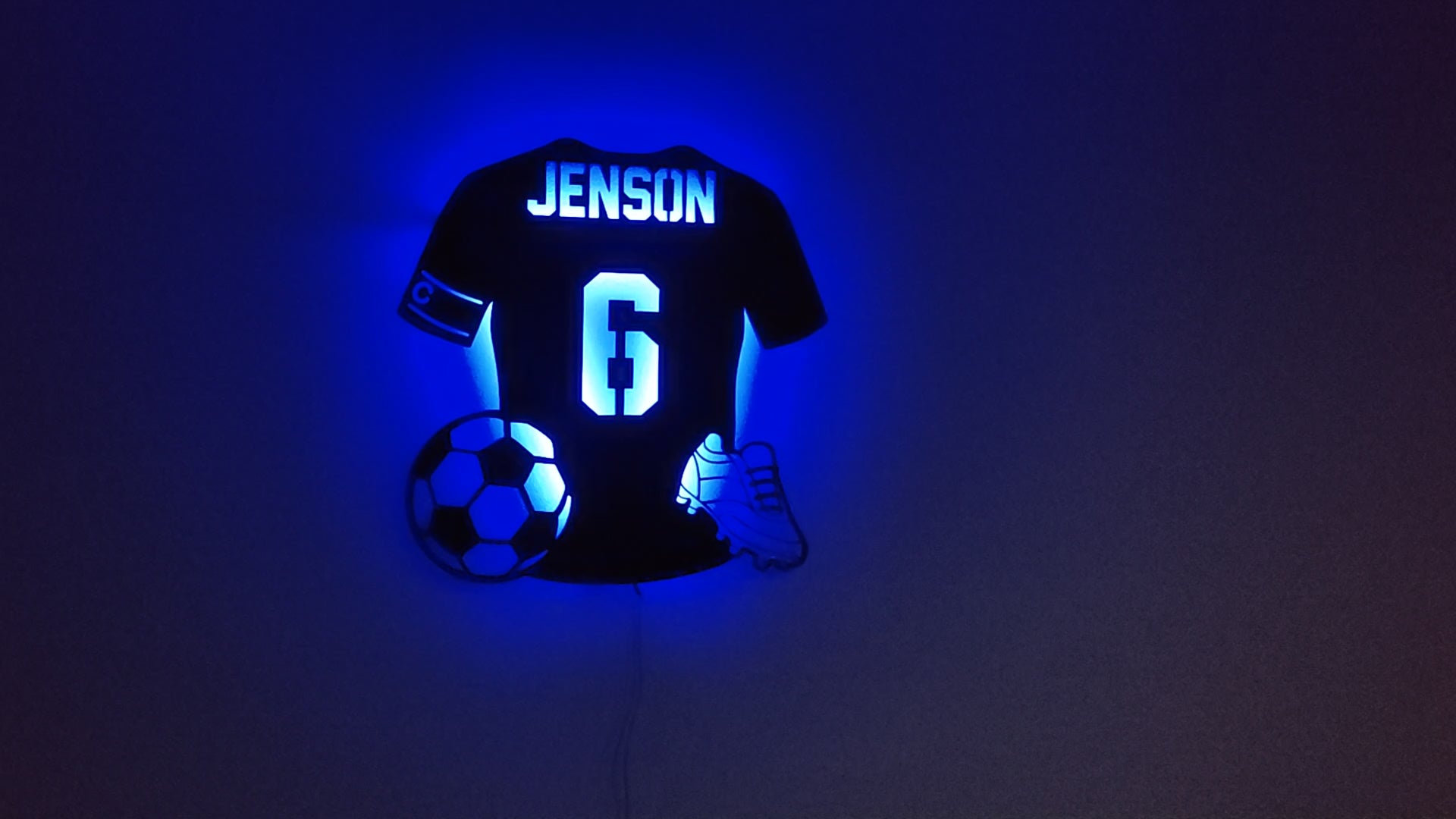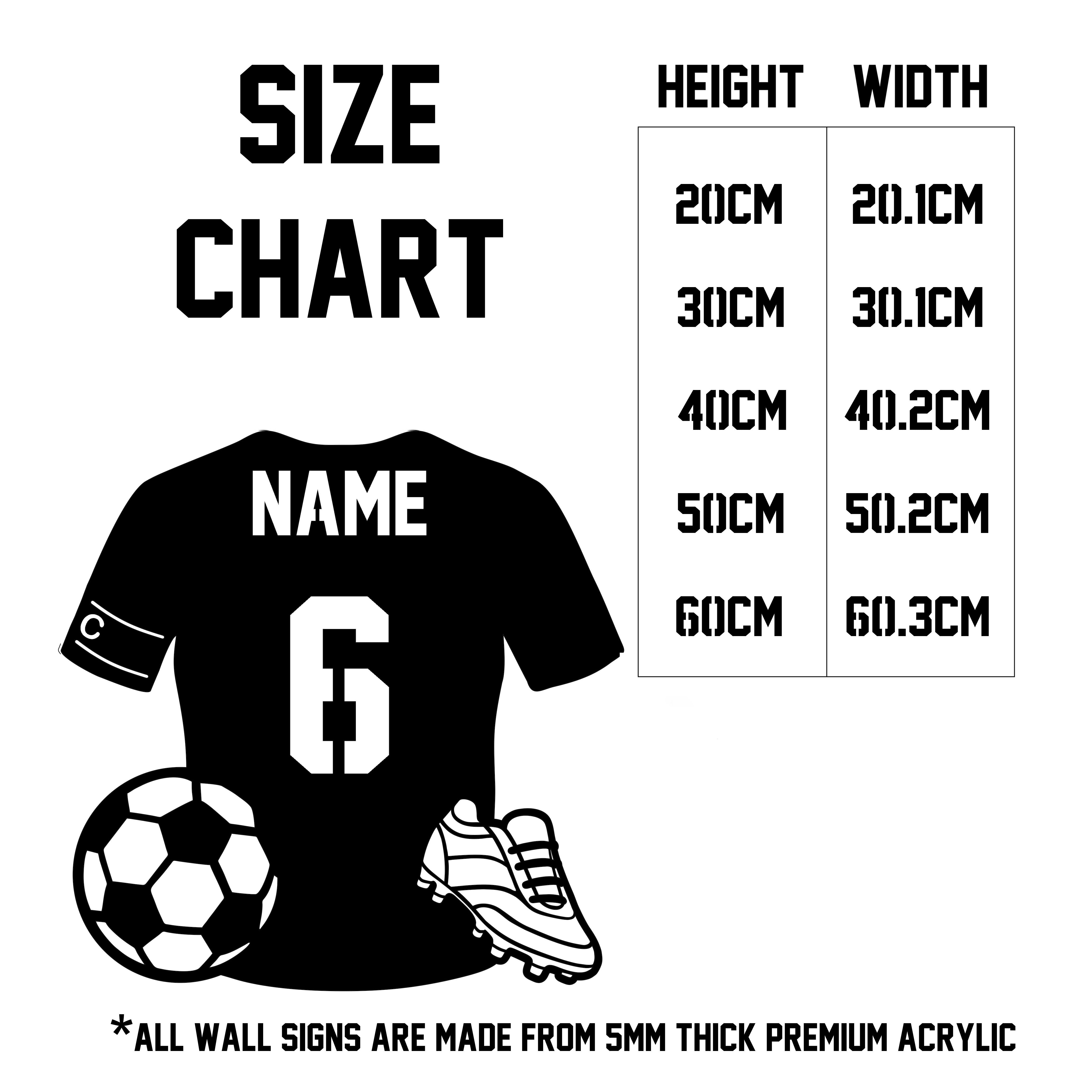 Football shirt wall sign with the name and number of your choosing, made from 5mm thick premium acrylic, available in a selection of 14 colour choices that can be anywhere from 20cm - 50cm tall and the choice of just the design by itself or with illumination.