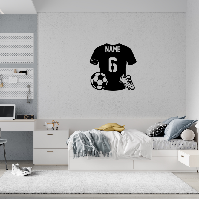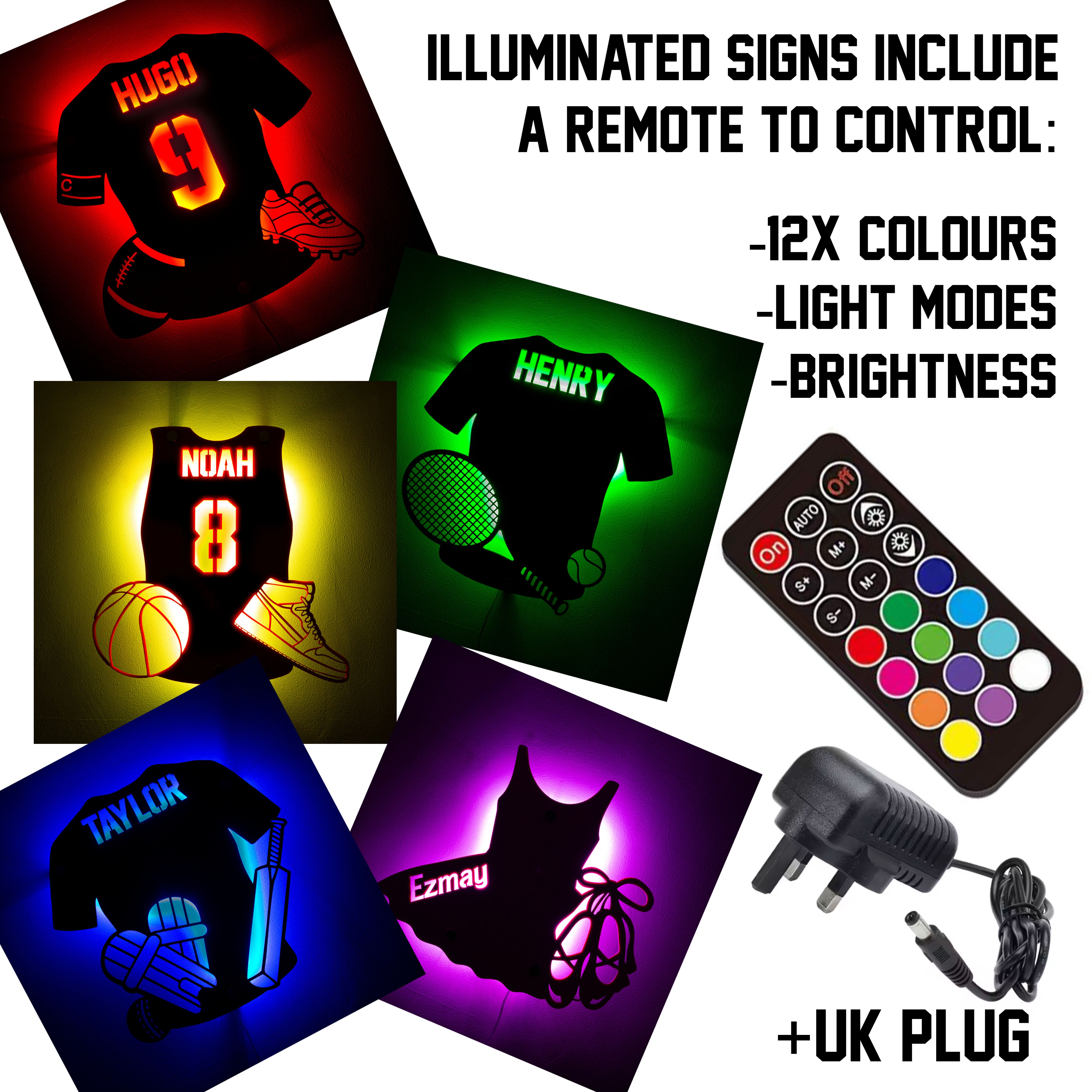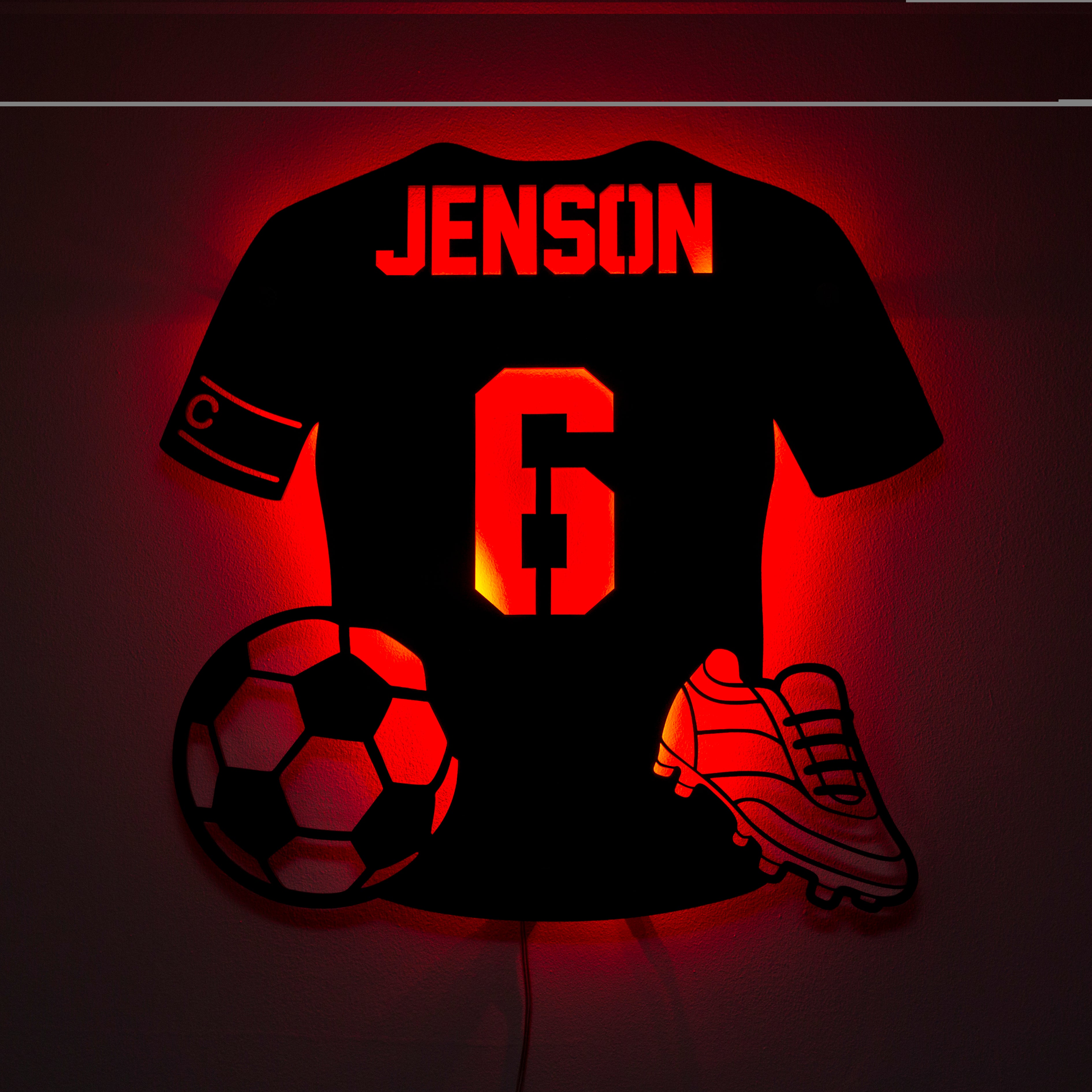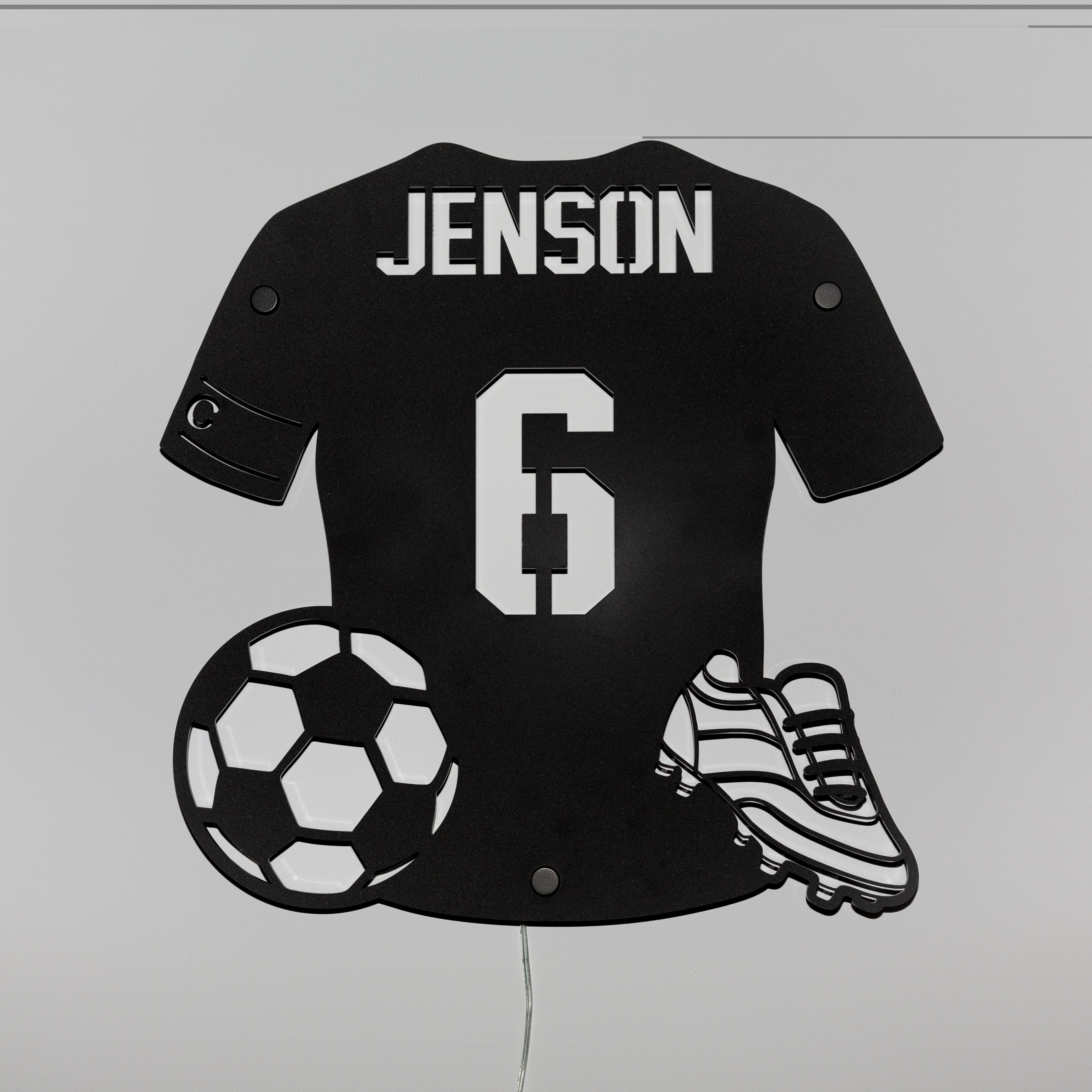 Football shirt wall sign with the name and number of your choosing, made from 5mm thick premium acrylic, available in a selection of 14 colour choices that can be anywhere from 20cm - 50cm tall and the choice of just the design by itself or with illumination.