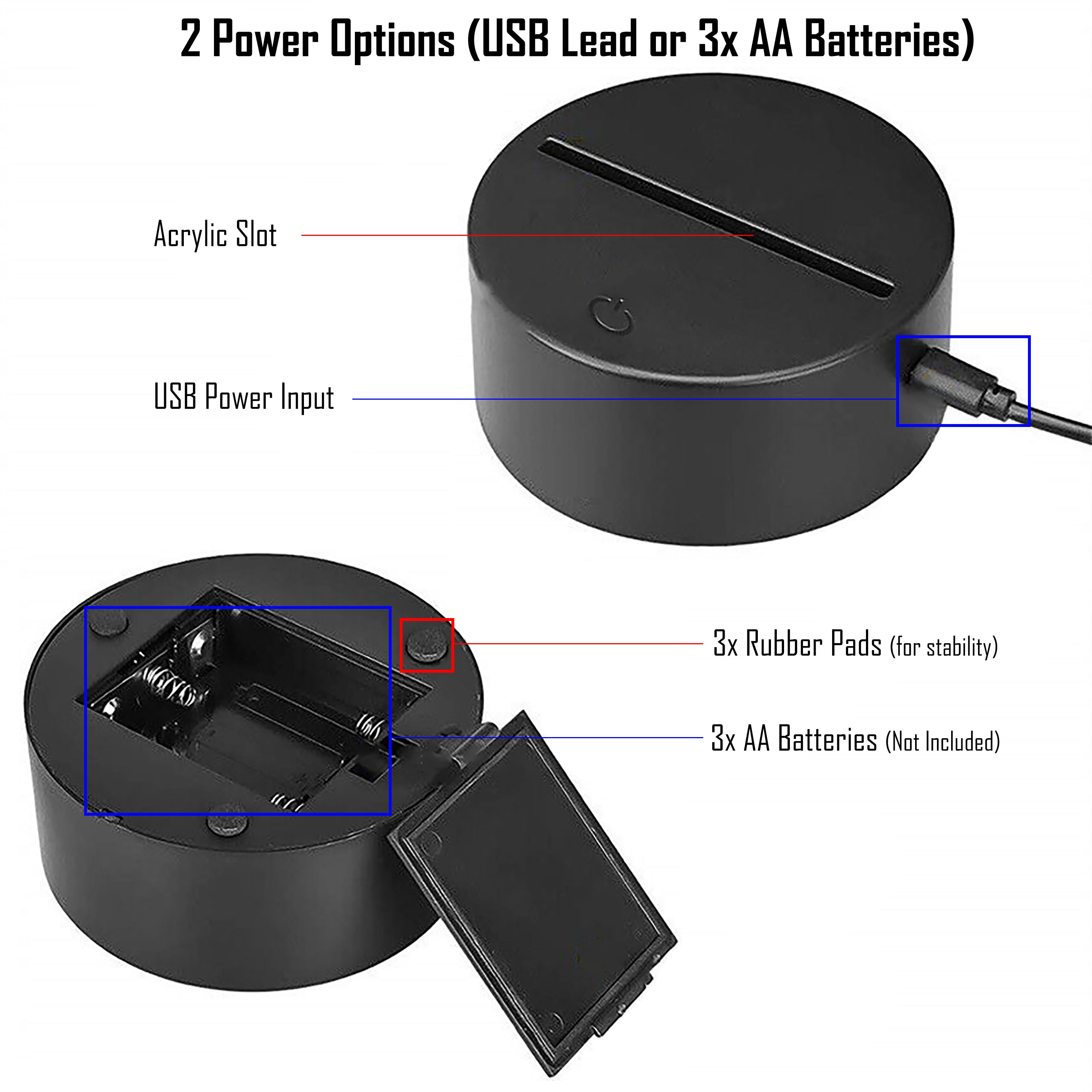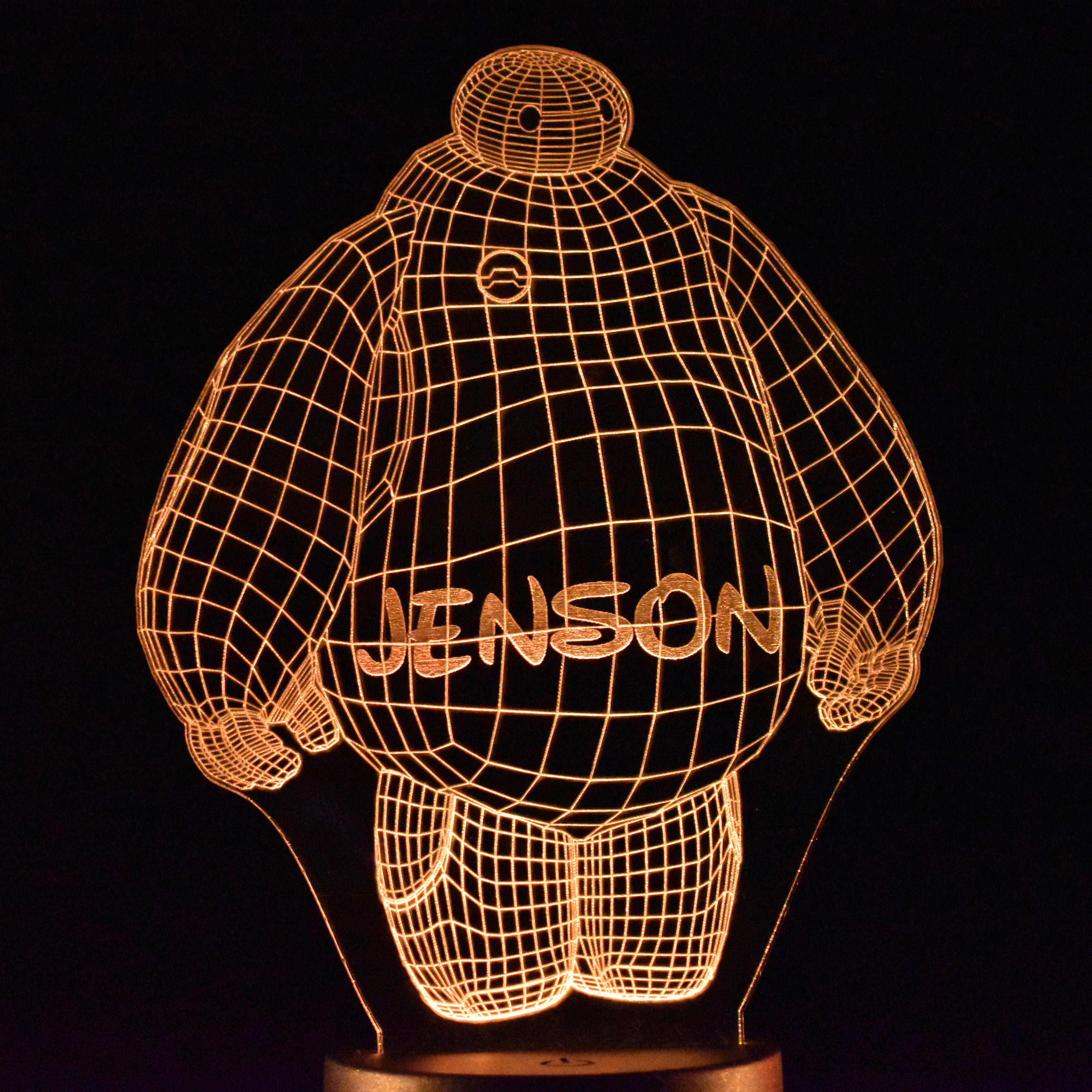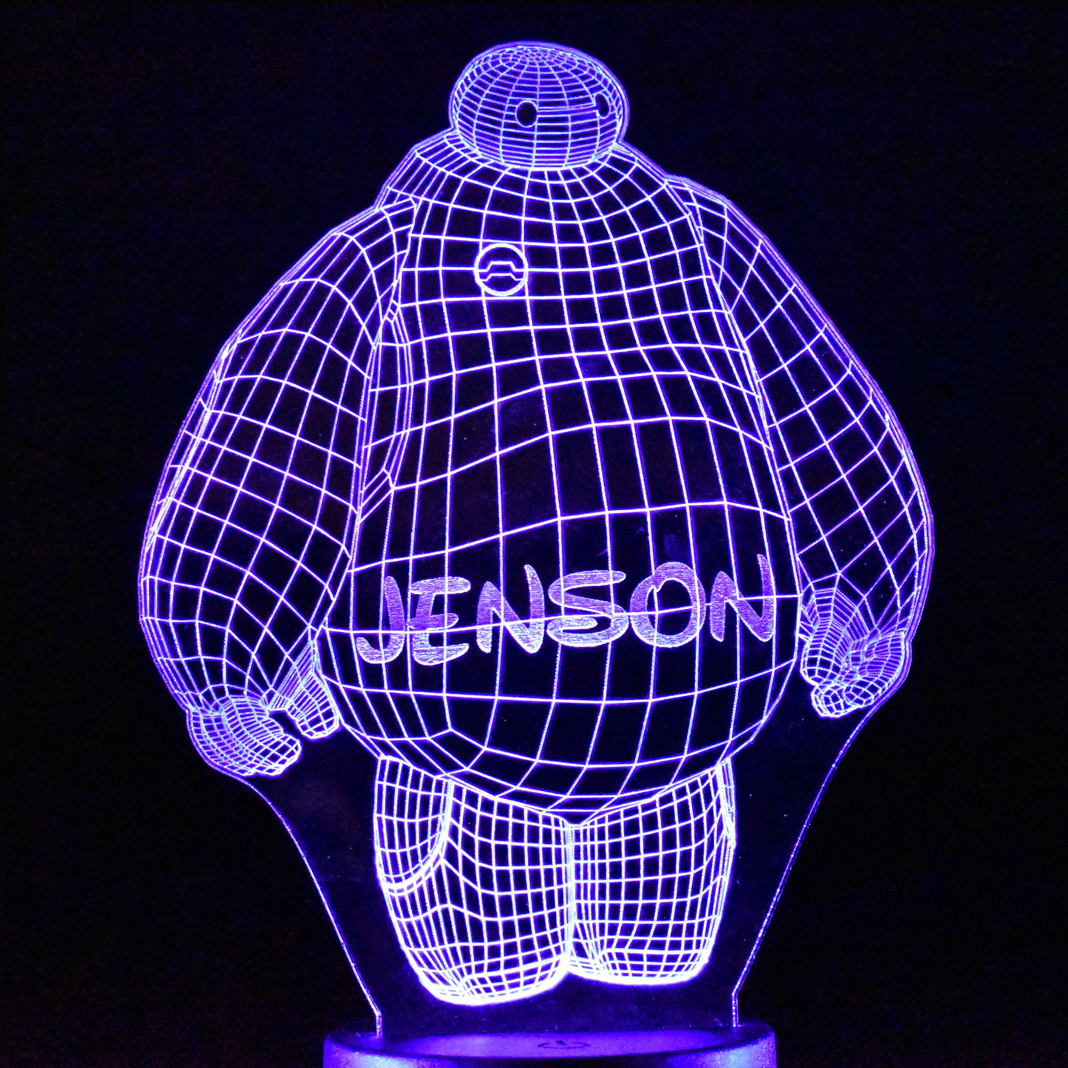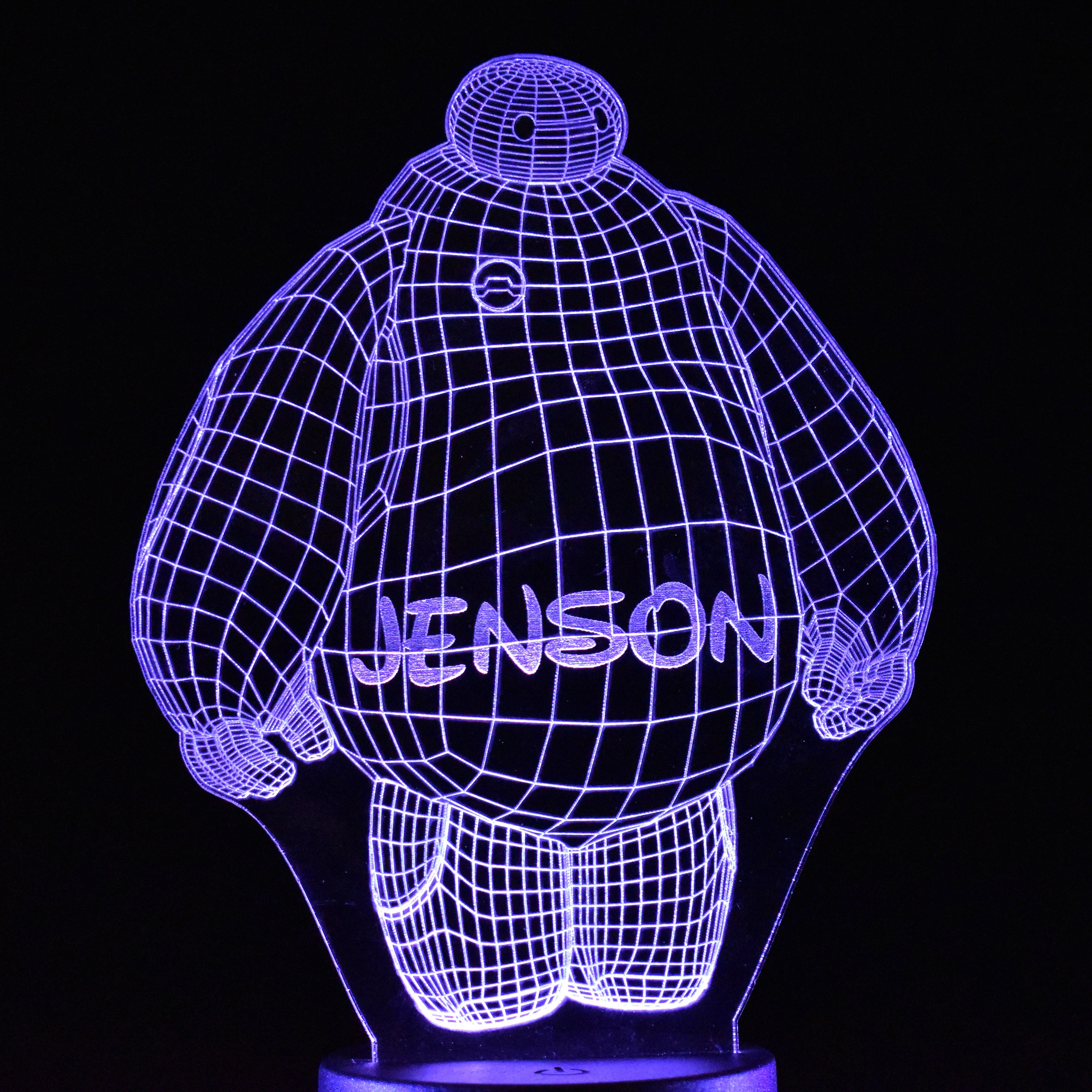 This Baymax design laser engraved night light is perfect for lighting any room. It has 16 colour options & different light modes that can be selected using the included remote control. The high quality tough clear acrylic is cut & engraved with our precision laser machine & lit with a circular LED base that can be powered by the micro USB cable included or with 3x AA batteries (not included).