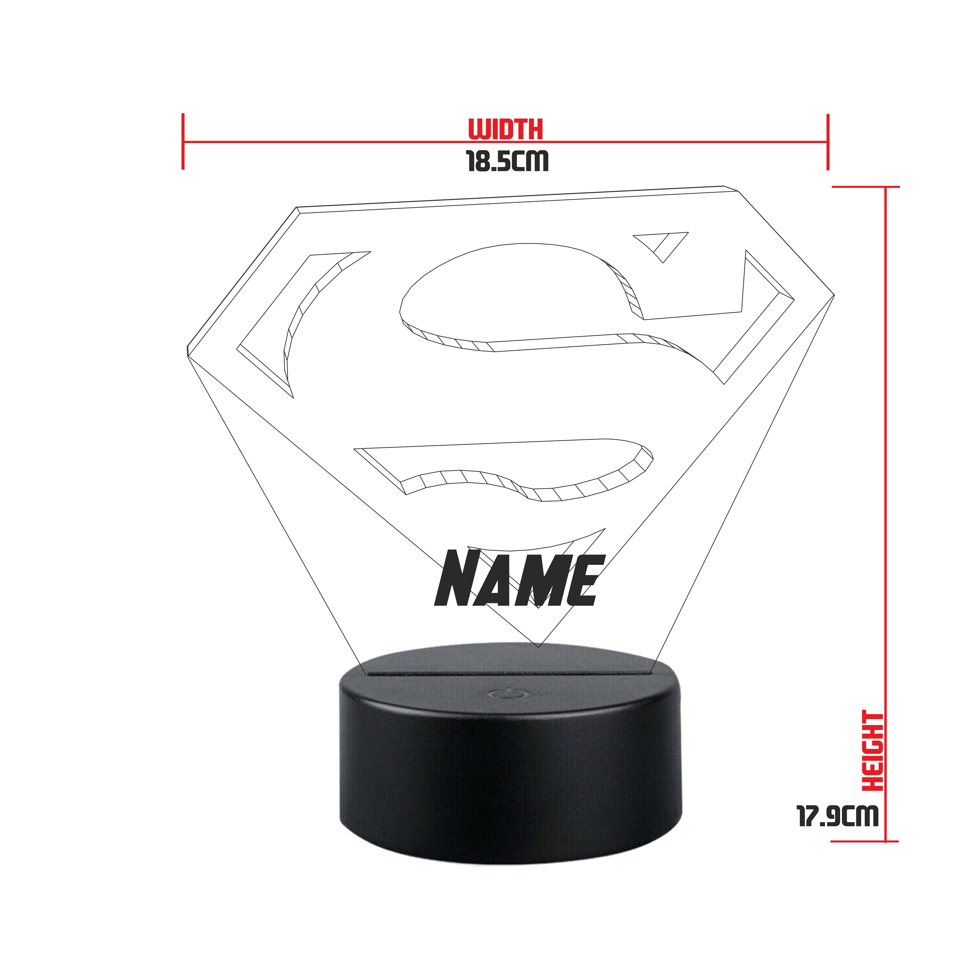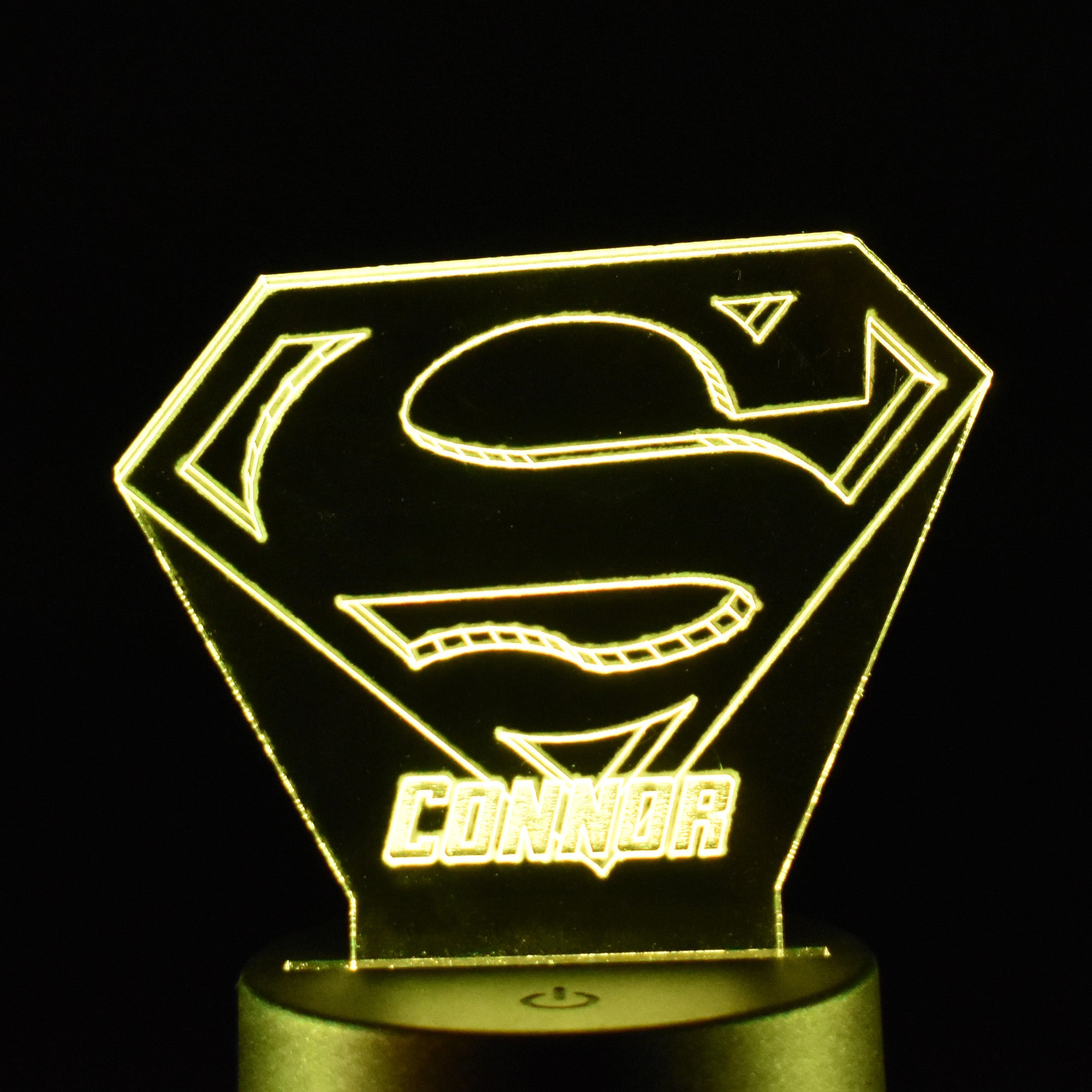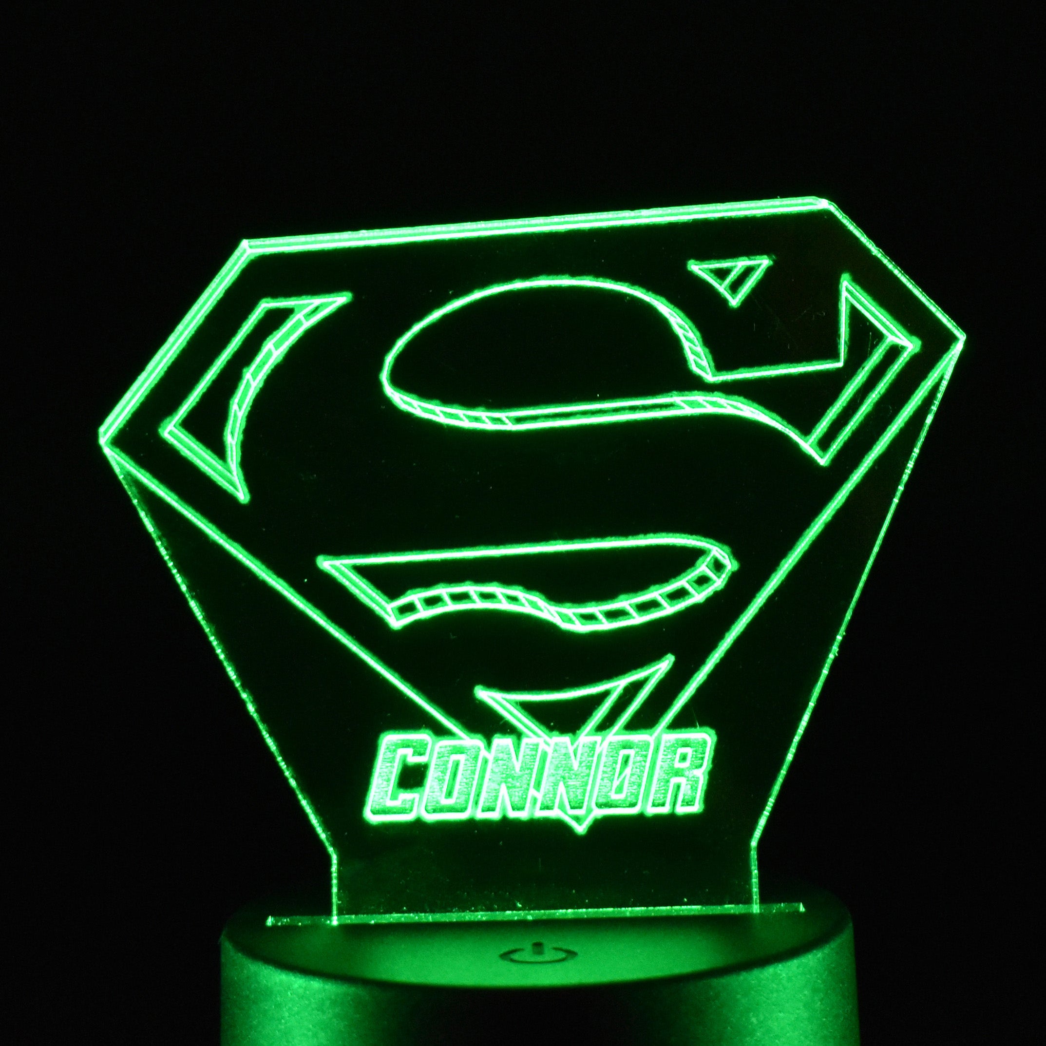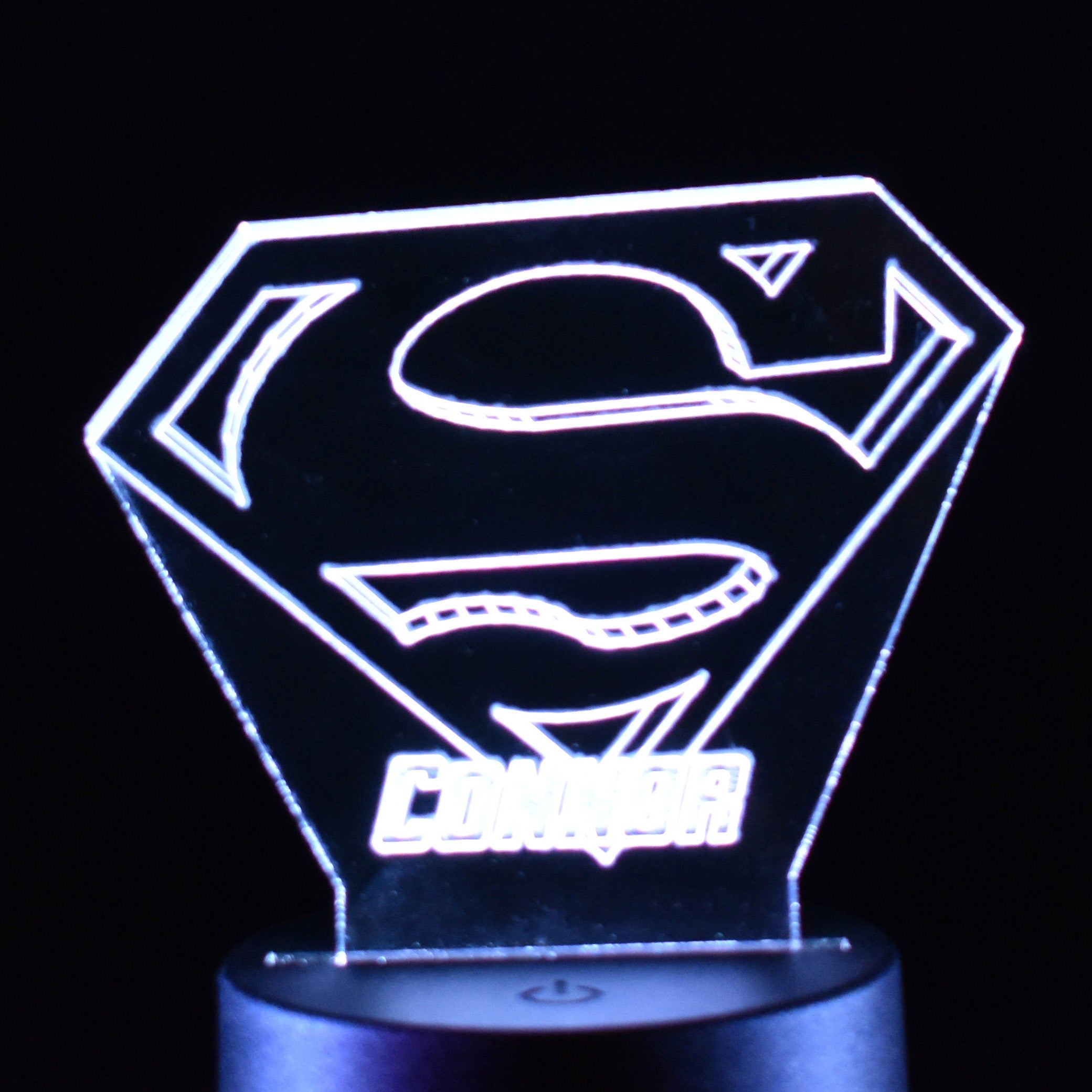 This Superman design laser engraved night light is perfect for lighting any room. It has 16 colour options & different light modes that can be selected using the included remote control. The high quality tough clear acrylic is cut & engraved with our precision laser machine & lit with a circular LED base that can be powered by the micro USB cable included or with 3x AA batteries (not included).